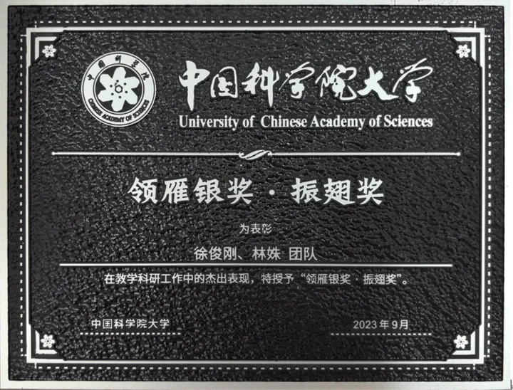 实验室徐俊刚、林姝老师获得2023年中国科学院大学领雁银奖9月 3, 2023 1 分钟阅读时长2023年9月,实验室徐俊刚、林姝老师由于教学科研工作中的杰出表现,被授予2023年中国科学院大学领雁银奖•振翅奖。徐俊刚教授/博导/实验室主任